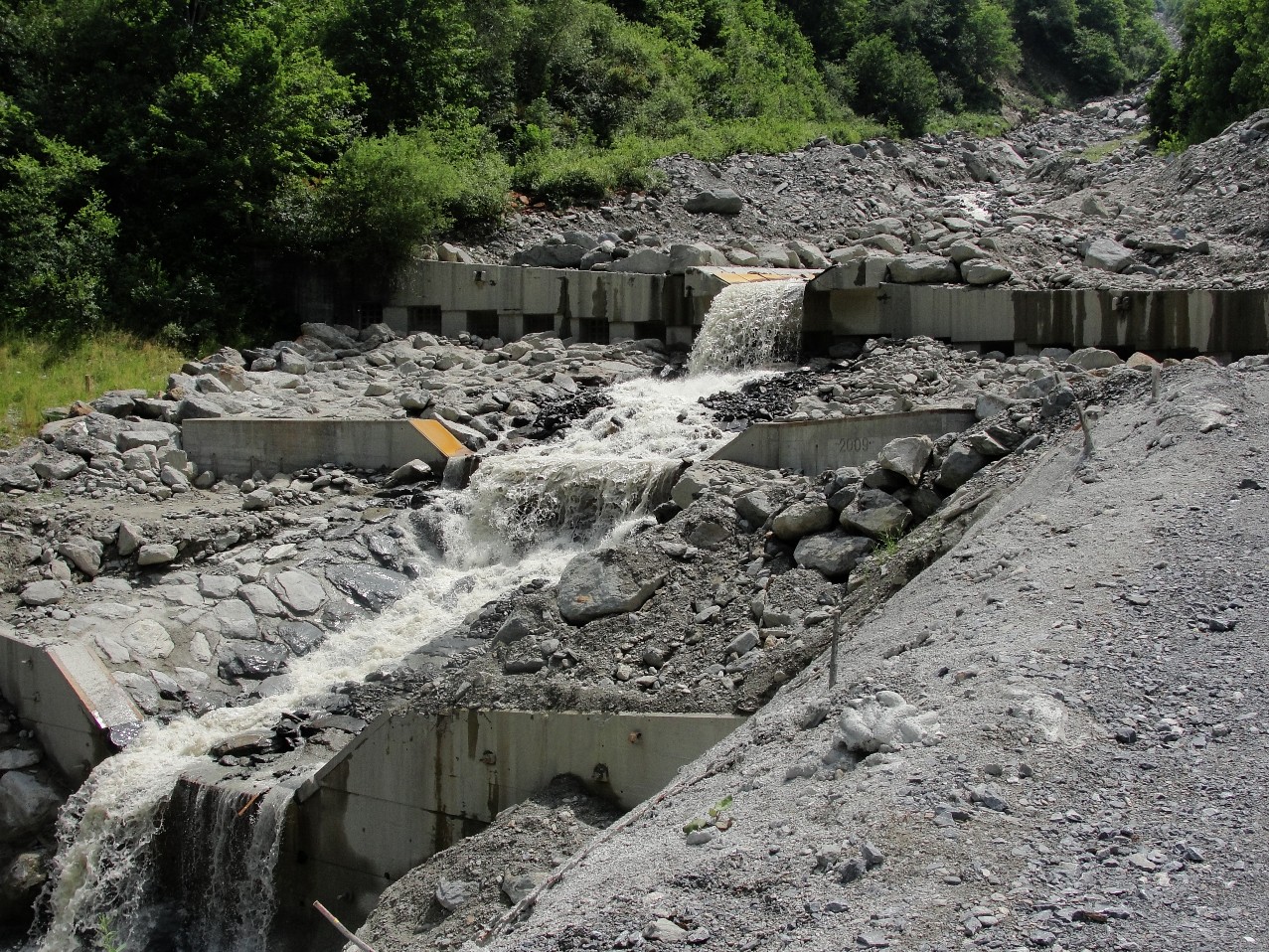 Galerie (hinten) sowie die vorgelagerten Sperren 1 und 2 zum Schutz der Transitgasleitung, die sich zwischen Galerie und Sperre 2 befindet; Aufnahme aus dem Helikopter. Das Bild zeigt die Situation am 25. Juli 2010 nach dem grossen Murgang vom 23. Juli 2010. Gut erkennbar ist der grosse Kolk unterhalb von Sperre 1.