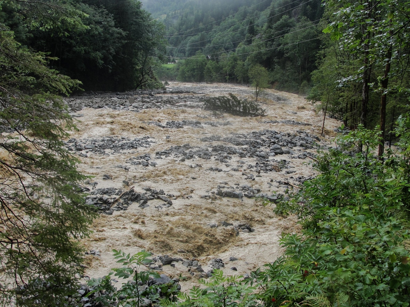 Die Ablagerungen in der Aare durch die Murgänge im Spreitgraben sind teilweise so hoch, dass sie die benachbarten Ufer überragen.
