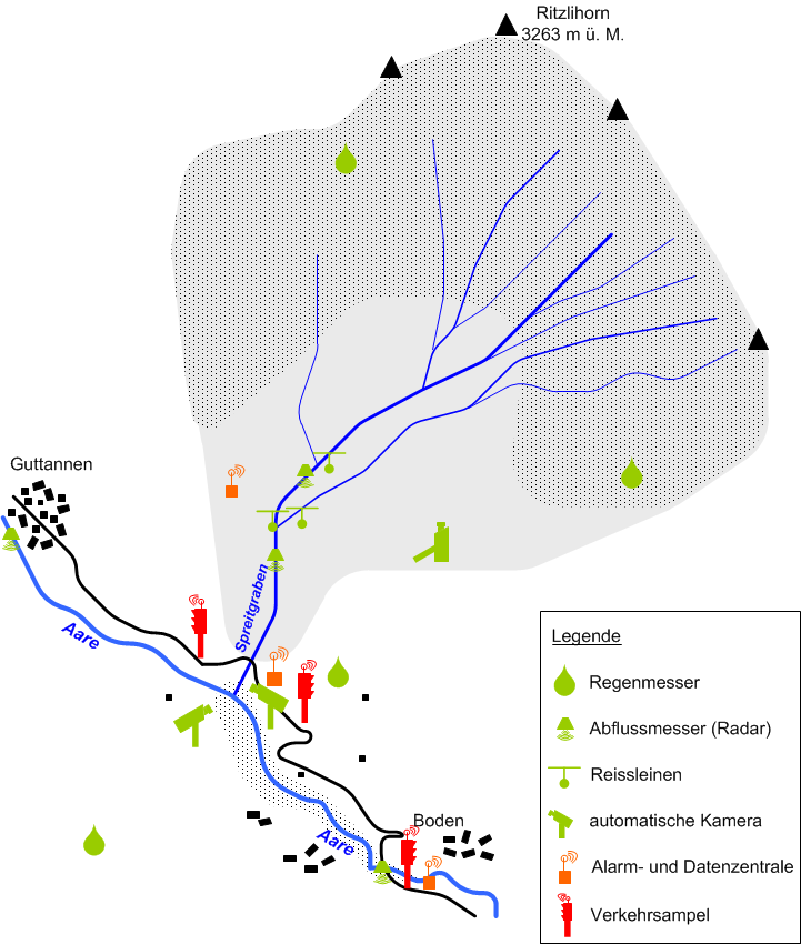 An verschiedenen Stellen im Gebiet sind ferner Regenmesser platziert. Diese erlauben einerseits, aus Murgängen, die bereits stattgefunden haben, die notwendige Regenmenge für deren Auslösung zu bestimmen. Anderseits tragen sie dazu bei, dass kritische Situationen für erneute Murgänge so früh als möglich erkannt werden können.